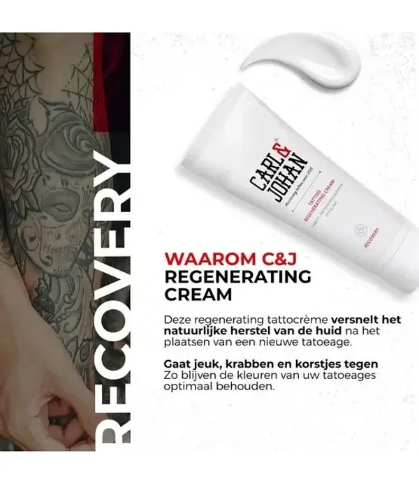 Het herstel van de huid is cruciaal voor het verkrijgen en het behouden van de perfecte tattoo. Onze Regenerating Cream vormt een beschermende laag tegen infecties, is verzachtend en zorgt voor een ultrahydraterend effect waardoor korstvorming (en de bijhorende jeuk) in grote mate vermeden kan worden. Hierdoor blijven de inktpigmenten optimaal behouden.